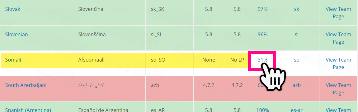 ابحث عن اللغة التي تريدها، وأضغط على النسبة المئوية الموجودة في عمود GlotPress. في هذا الشرح أجريت المثال على لغة Somali، ولذلك قمت بالضغط على نسبة 31% في عمود GlotPress والمتواجدة أيضًا في صف هذه اللغة.