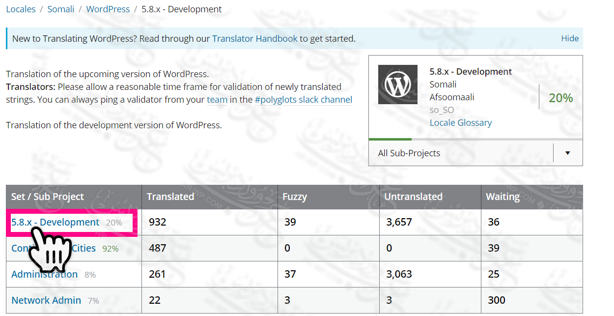 سوف تنتقل مباشرة إلى صفحة مخصصة باللغة / الترجمة التي اخترتها، فقم بالنصر فوق إصدار الووردبريس وهو هنا 5.8.x development؛ وذلك لأن نسخة 5.8 هي أحدث إصدار من ووردبريس حتى تاريخ كتابة هذا الشرح.