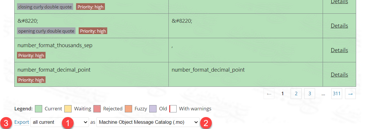 بعد الضغط على 5.8.x Development تنتقل إلى صفحة أخرى فيها كافة الجمل المترجمة، في آخر الصفحة من خانة Export اختر all current واختر نوع الملف .mo (Machine Object Message Catalog) ثم اضغط على Export لتحميل الملف لديك على الكمبيوتر.
