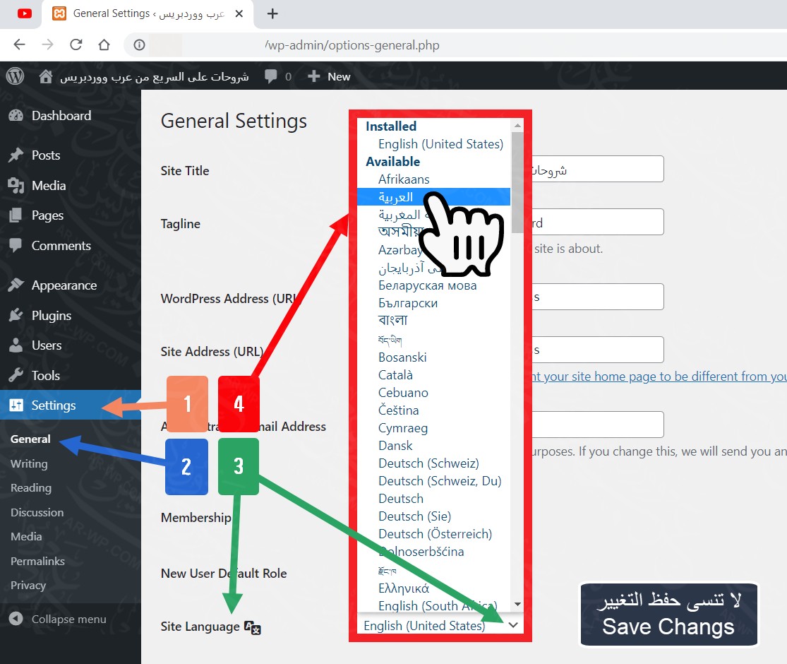 خطوات تغيير لغة موقع الووردبريس من لوحة التحكم