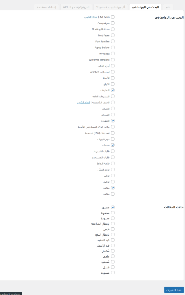 بعد ذلك، قمت بالانتقال إلى تبويب “أي روابط يجب فحصها“، وقمت بتحديد أنواع الروابط التي أحتاج إلى أن تقوم الإضافة بفحصها تلقائيًا مثل روابط HTML، الصور، العناوين النصية، الفيديوهات. ويمكن تحديد قائمة روابط يتم استبعادها من الفحص، ولكن في موقعي قمت بتضمين كافة الروابط التي استخدمها.
