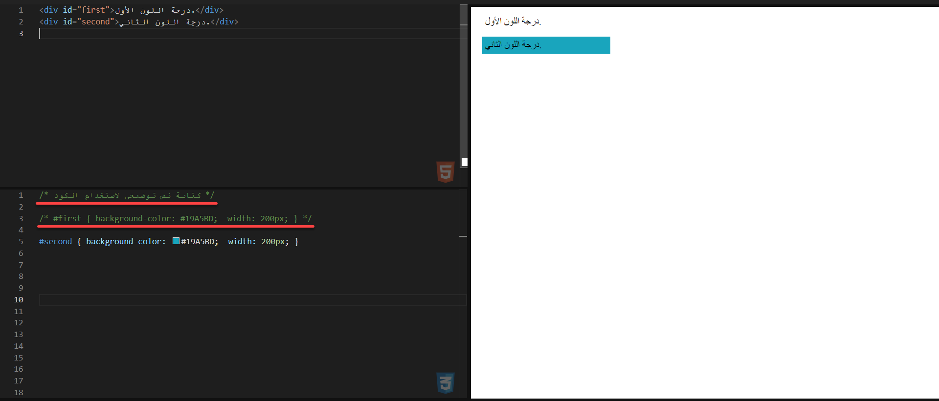 ستلاحظ أن نص التعليق لم يظهر في نتيجة كود CSS، وكذلك تم إلغاء تفعيل كود CSS الخاص بالخلفية والحجم عن إضافة رمز “/*” في بداية ونهاية الكود.