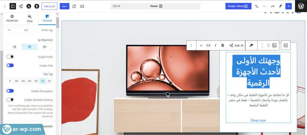 مثلًا، يمكنك تخصيص واجهة المتجر بتحديد العنصر المطلوب ثم تخصيص مظهره أو تعديل محتواه من خلال المحرر المرئي (Visual Builder).